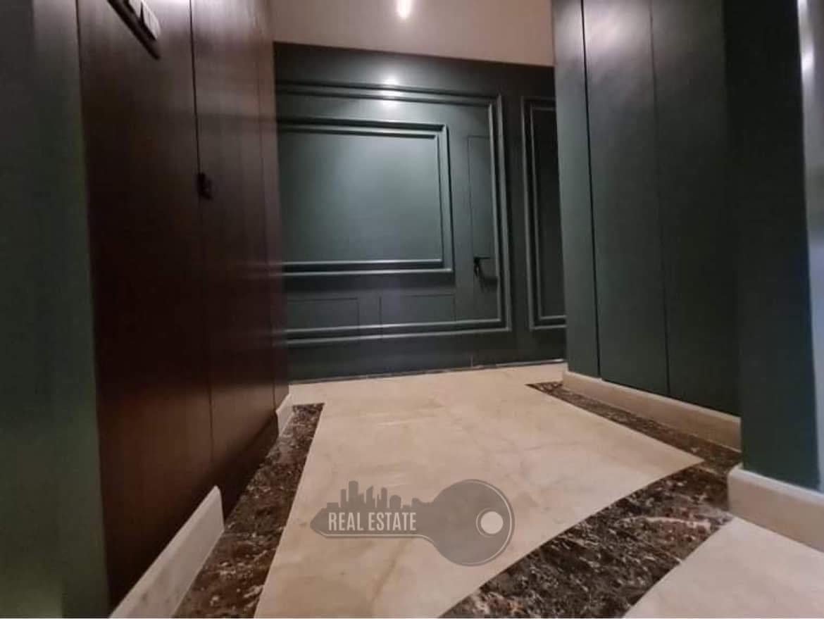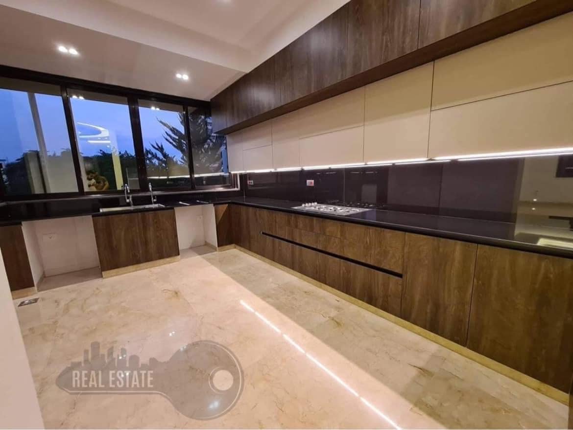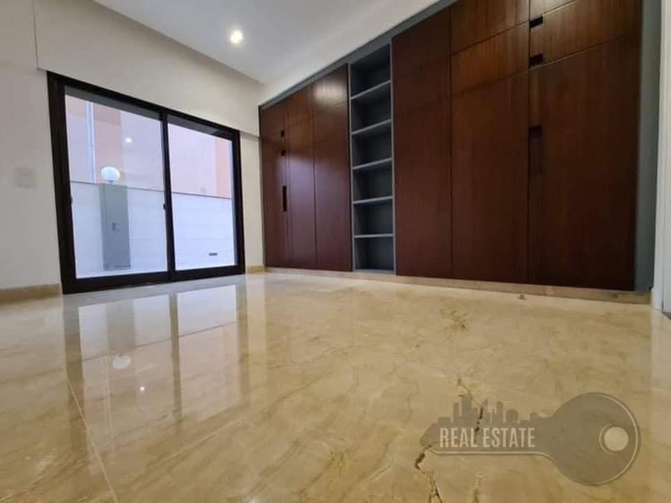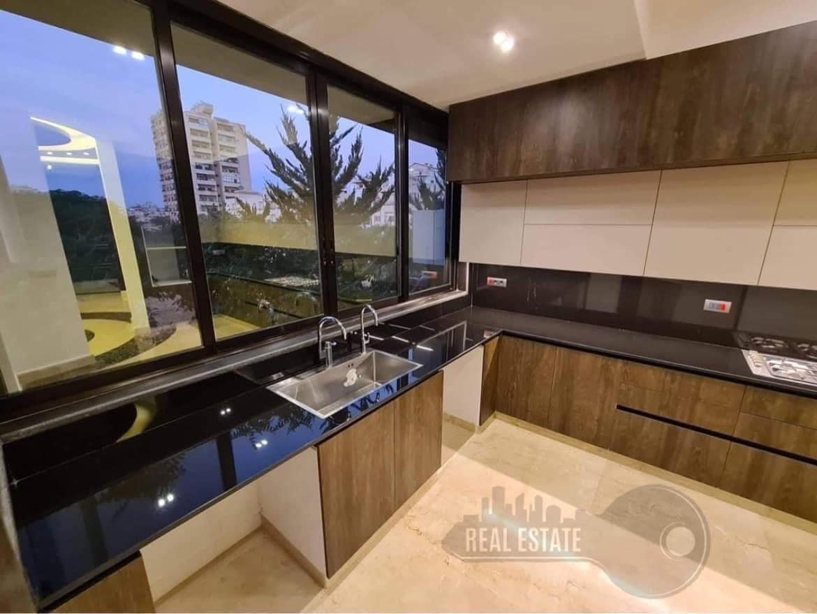 مطبخ + ثلاثة غرف نوم احداها ماستر + حمامين + تراسين