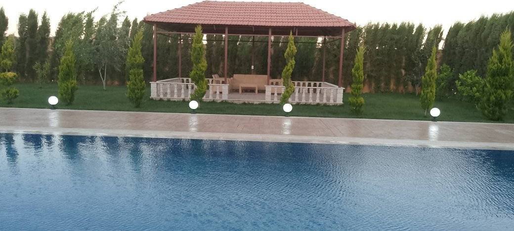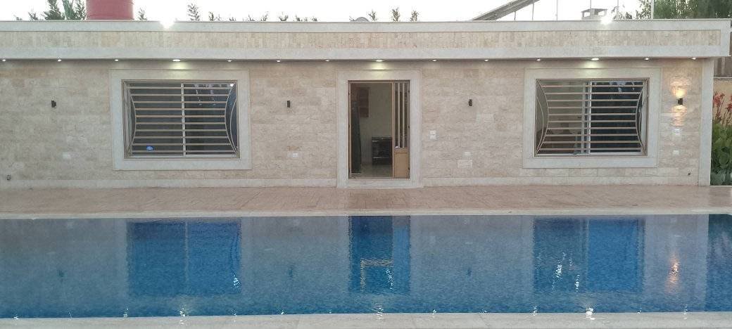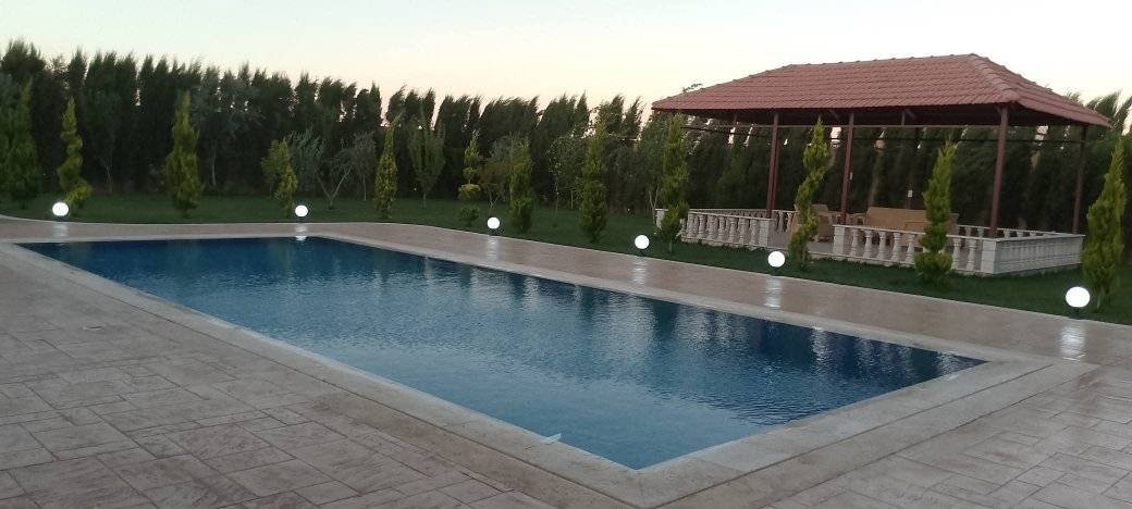 التوزيع غرفتين نوم صالون مطبخ مفتوح مسبح _ بير ماء _ مشالح خاصة بالمسبح