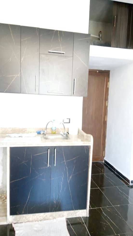 للبيع في جرمانا قرب ساحة النجوم سويت غرفة مع مطبخ امريكي مع حمام كسوة ديلوكس مساحة بحدود 30م في بناء حجر طابق رابع ليس الاخير موجود مصعد واجهة بانورامي اتجاه قبلي اطلالة على الشارع العام