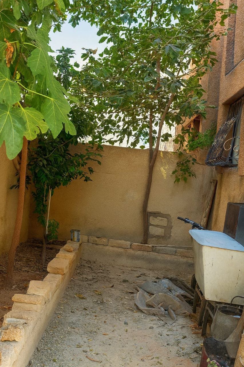 مكونات الحديقة شجر مشكل من تين وتوت وزيتون ودراق ورق عنب ورمان وجارنك + باب خارجي من الحديقة والحديقة مشغول فيها حواض وارضية باطون