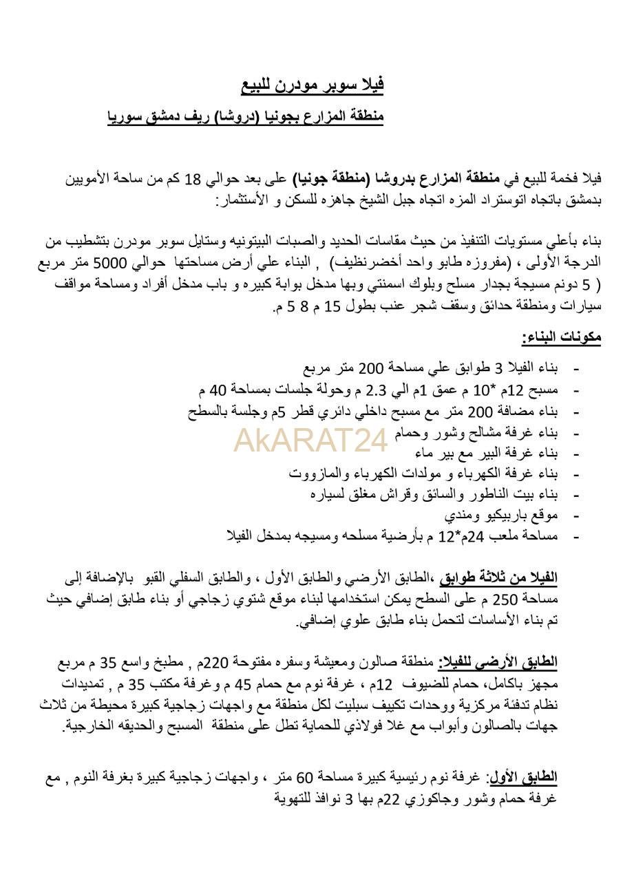 للبيع فيلا فخمة في منطقة المزراع بدروشا ( منطقة جونيا ) على بعد حوالي 18 كم من ساحة الأمويين بدمشق باتجاه اتستراد المزة اتجاه جبل الشيخ